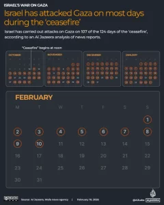Volgens een analyse van Al Jazeera heeft Israël Gaza 107 van de afgelopen 124 dagen van het staakt-het-vuren aangevallen, wat betekent dat er slechts 17 dagen waren waarop geen gewelddadige aanvallen, doden of gewonden werden gemeld. Ondanks de aanhoudende aanvallen houden de VS vol dat het “staakt-het-vuren” nog steeds standhoudt.
