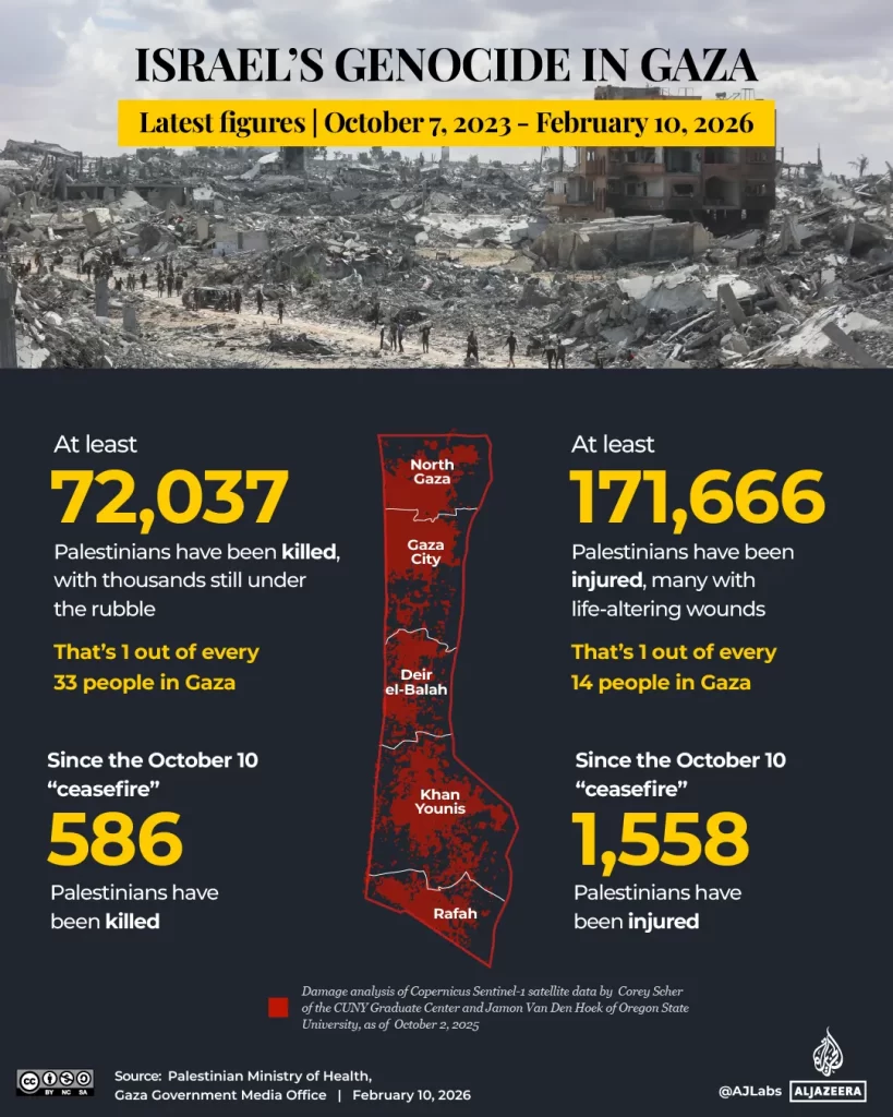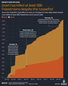 Sinds het staakt-het-vuren van kracht is geworden, hebben Israëlische aanvallen ten minste 586 Palestijnen gedood en 1.558 verwond. Sinds de afkondiging van een staakt-het-vuren in de Gazastrook op 10 oktober 2025 heeft Israël de overeenkomst geschonden met bijna dagelijkse aanvallen, waarbij honderden mensen om het leven zijn gekomen. Tussen 10 oktober 2025 en 10 februari 2026 heeft Israel het staakt-het-vuren minstens 1620 keer geschonden door middel van aanhoudende aanvallen vanuit de lucht, met artillerie en door rechtstreeks op het doelwit te schieten, meldt het regeringsmediabureau in Gaza. Het bureau meldde dat Israël 560 keer op burgers heeft geschoten, 79 keer woongebieden buiten de ‘gele lijn’ heeft bestormd, Gaza 749 keer heeft gebombardeerd en beschoten, en 232 keer eigendommen van mensen heeft verwoest. Het voegde eraan toe dat Israël ook 50 Palestijnen uit Gaza heeft vastgehouden. Israël blijft bovendien essentiële humanitaire hulp blokkeren en huizen en infrastructuur in de Gazastrook vernielen.