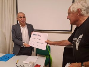 directeur Aed Yaghi krijgt een symbolische cheque van voorzitter Bert Giskes met een donatie voor de PMRS