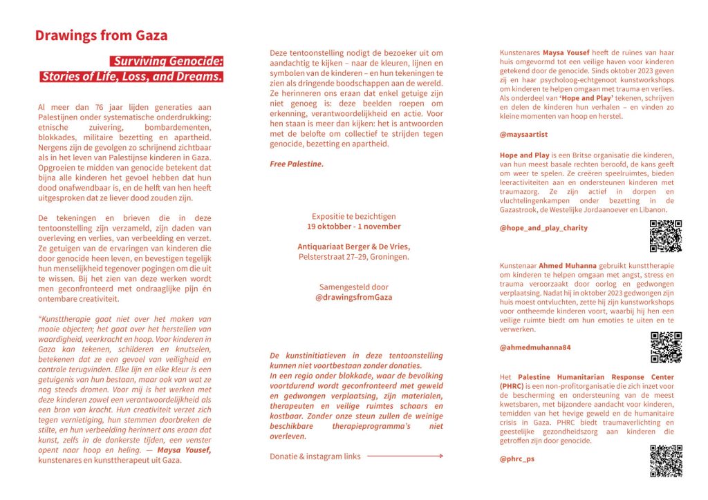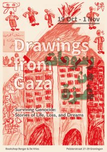 Van 19 oktober tot 1 november organiseer ik vanuit dit platform een expositie in Antiquariaat Berger & de Vries in de Pelsterstraat 27- 29. Het te exposeren materiaal ligt klaar en de openingsdag wordt ingericht met een workshop waar jong en oud hun eigen poster of tekening kunnen maken, als reactie op de getoonde tekeningen uit Gaza. Ook wordt er nog een film vertoont die meer achtergrond biedt over de aard van de decennia lange bezetting en onderdrukking van Palestijnen.